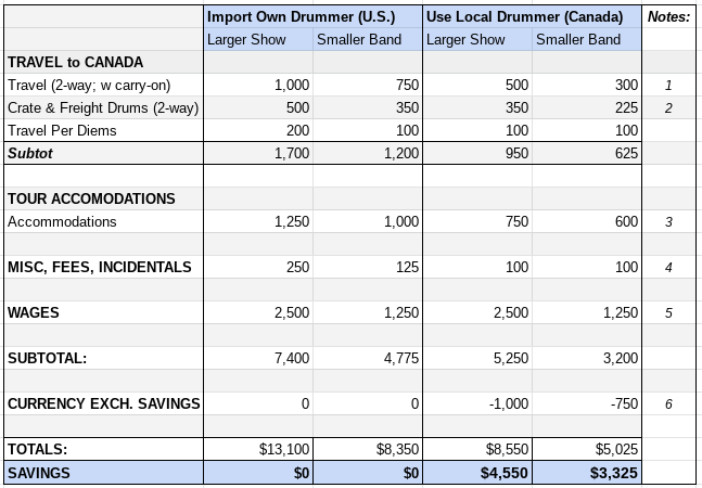 In this example of a USA Band using a Canadian Drummer for a Canadian Tour, Savings could amount to Several Thousand Dollars depending on the Scope of Production